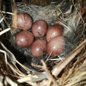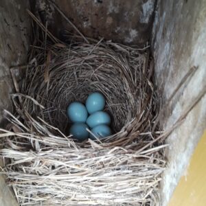 Monitoring is focused on the 40 nest boxes along our trail. However, most birds at Landis nest elsewhere such as in trees, on the ground or in some of our buildings. On my weekly monitoring trek, it’s hard not to notice some of these other nests. For instance, there’s an American Robin nest in the Shanti-Vun Meditation Garden pavilion, an Eastern Phoebe nest in the visitors parking lot kiosk, a Song Sparrow nest in the field below the barn (see picture below), and an unidentified “little brown bird” nesting in the dinosaur sculpture.