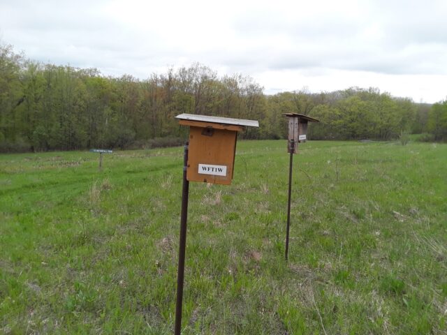 New for 2025! In late winter we installed four nest boxes in the field behind the Waterfall Trail parking lot. It appears that birds like them. Tree Swallows have started a nest in WFT1W. The other pair of boxes, far in the background, have been favored by Bluebirds; they have completed a nest and laid eggs in WFT2W (see next photo).