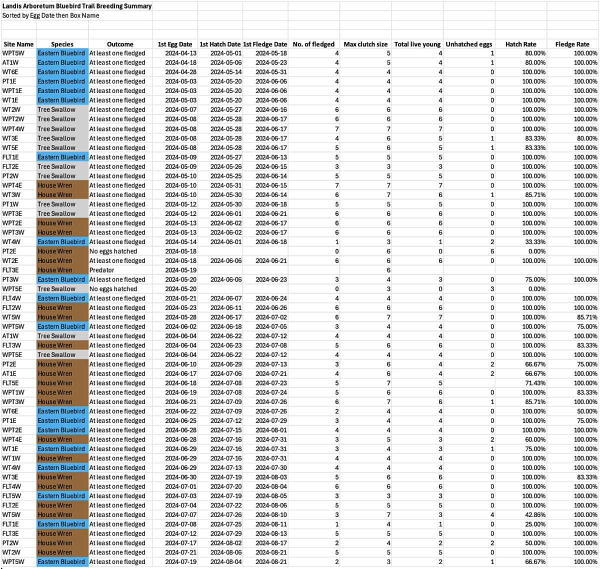 Landis Arboretum Bluebird Trail Breeding Summary