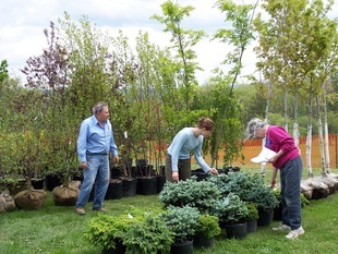 Trees and shrubs. Basic advice for beginning landscapers: think long-term. Consider how the tree will appear in ten or more years. A dwarf hybrid ornamental crabapple tree at the sale will be roughly 5 feet tall and in ten years may only reach a height of 7 feet. On the other hand, an edible apple tree may be 5 feet tall when purchased, yet later might reach 15 and eventually 25 feet. Shrubs often found at the sale include rhododendron, azalea, lilac, juniper, and rose. Trees include edible and ornamental fruit varieties, dogwood, pine, maple, willow, and the latest show-stopping ornamental conifers.