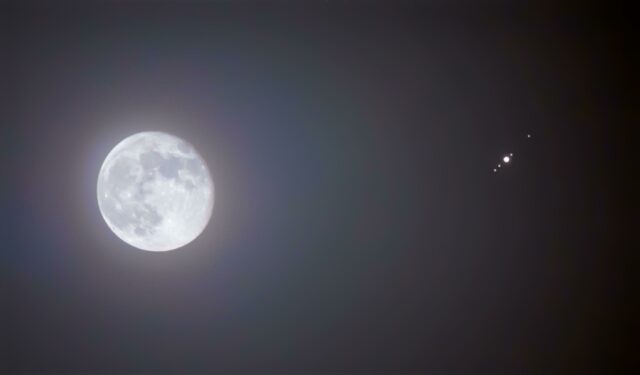 - During the May 26 and 27 star parties, Jupiter will be due south at its highest. A telescope reveals dark bands in its atmosphere and other details, as well as its four bright Galilean moons. By June 9, the full moon will be rise in the east-southeast at 8:34 PM, with Saturn just 2.5 degrees to its lower right.