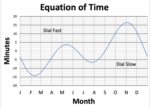 This dial can be used to accurately set one’s watch to within a minute or two, if one knows how to read it! To do so, read the dial and apply the 'Equation of Time,’ a variable quantity that needs to be added to (or subtracted from) the dial reading to obtain 'Mean Time.' This is necessary because sundials show 'Apparent Solar Time,' while watches keep 'Mean Solar Time.' The 'Equation of Time' (EOT) is simply the difference between the two. An EOT plot is included in this article. It shows, for a given date, the correction, in minutes, to apply to the dial reading. If the EOT is negative, that means the dial will be slow relative to watch time and that the number of minutes must be ADDED to the dial reading. If the EOT is positive, SUBTRACT it from the dial reading.